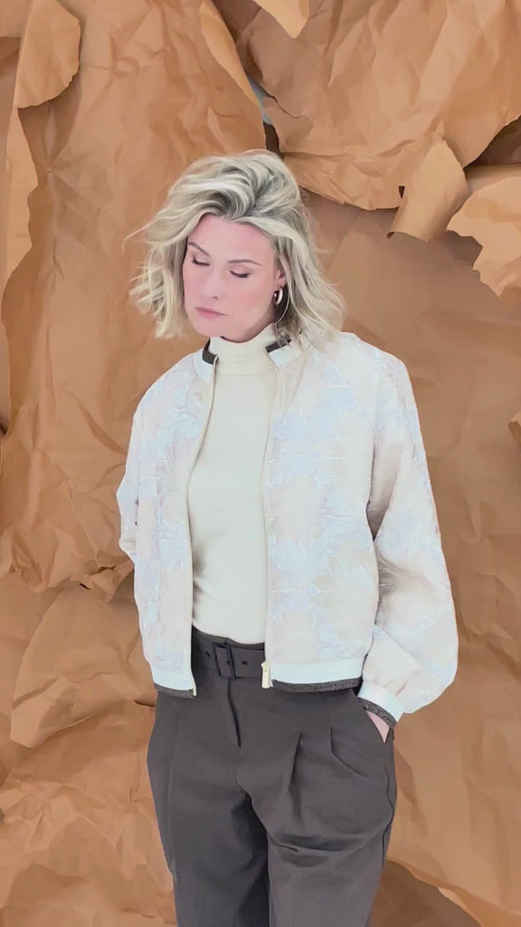 Leuke bomberjacket met een geborduurde bloemmotief en gouden details. Verkrijgbaar in de kleur sand.