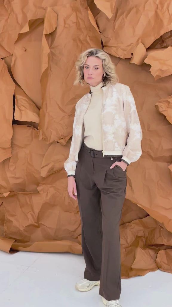 Wijde broek met leuke plooien en een mooie riem in dezelfde warme bruine kleur waar in de broek zelf ook komt.