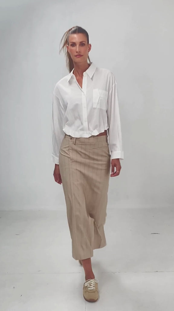 Witte cropped blouse met kraag en een doorlopende knoopsluiting. Voorzien van een steekzak op de borst voor een casual touch. De boord is aan de zijkanten afgewerkt met een koordje dat strak getrokken kan worden, waardoor een speels pofeffect ontstaat. Een trendy en veelzijdige blouse die perfect combineert met verschillende stijlen.